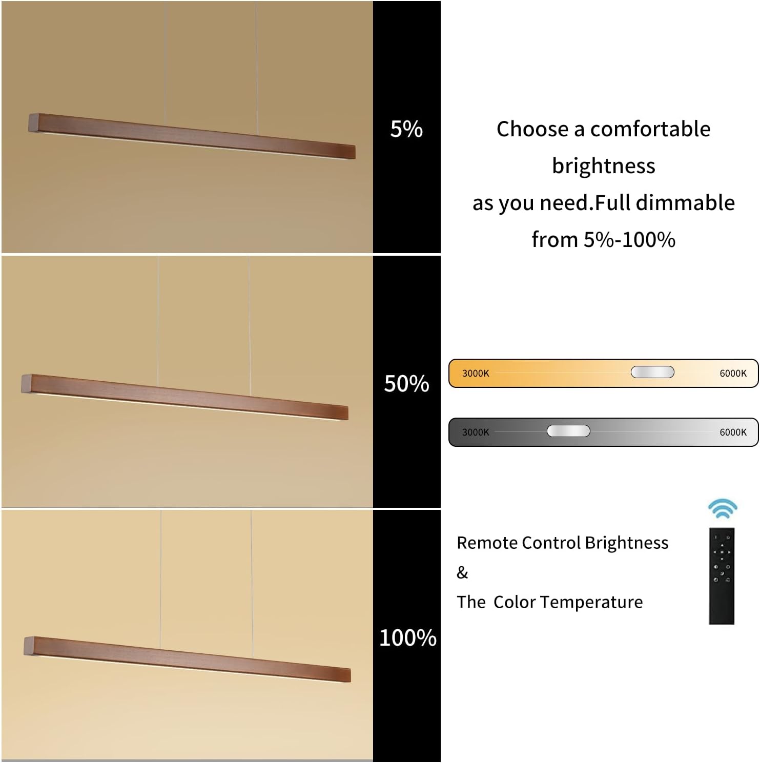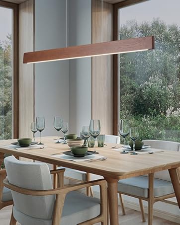 【DIMENSIONS】:This wood linear dining room pendant lighting is a simple streamline design, wooden parts:59 x 1.7 x 1.7 inches(l*w*h). it’s a square design.the mounting part:18.9 x 4.3 x 1.4 inches(l*w*h) can cover usa standard electrical boxes.the maximum height of the chandelier is 78 inches.notice:please do not use dimming switch, dimming equipment has been configured inside the light, please use ordinary wall button switch. otherwise the light fixture may flicker.