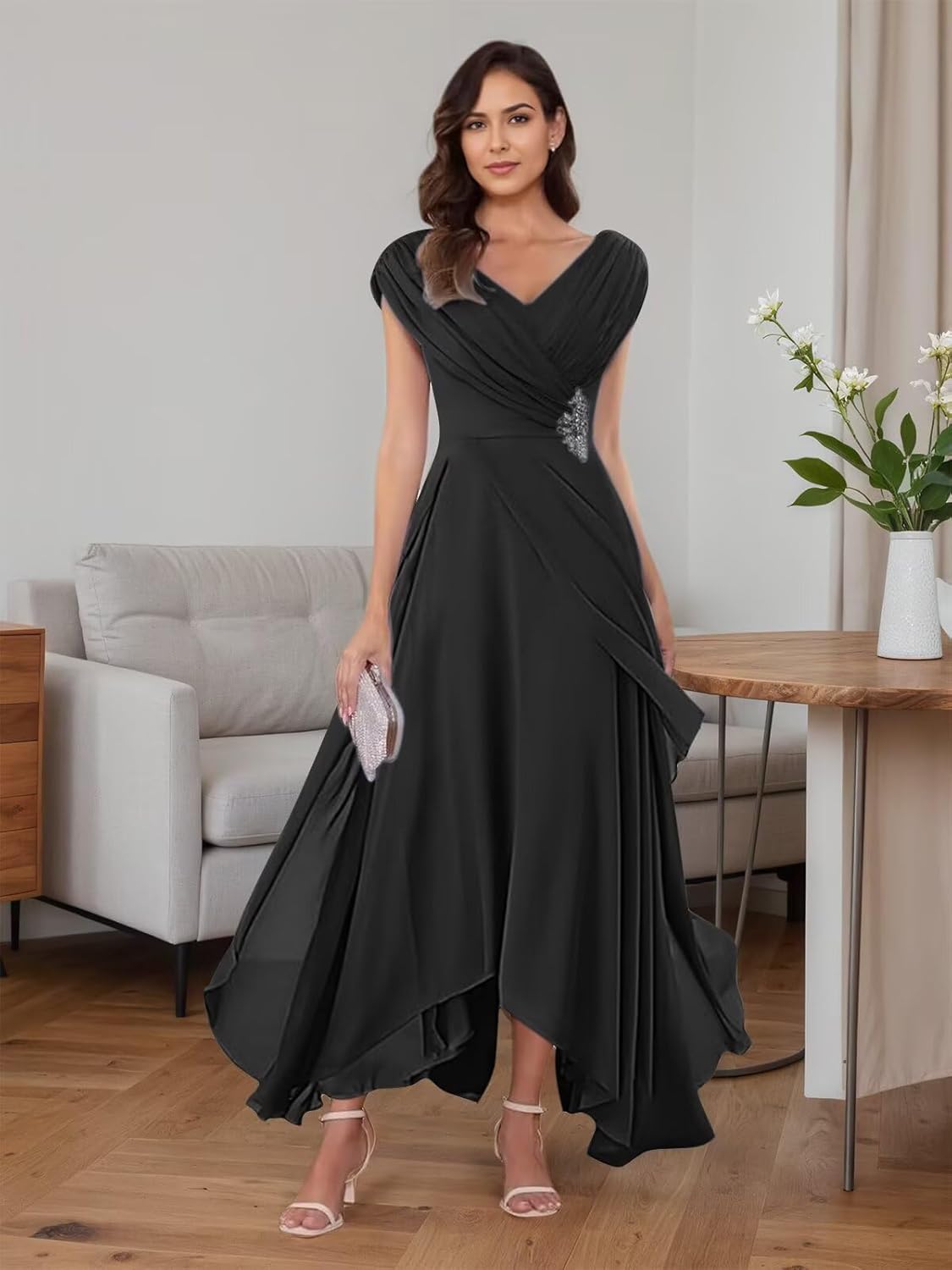 Yhhkjg V Neck Chiffon Mother of the Bride Dresses for Women Black A Line Evening Party Gown Cap Sleeves Formal Dress