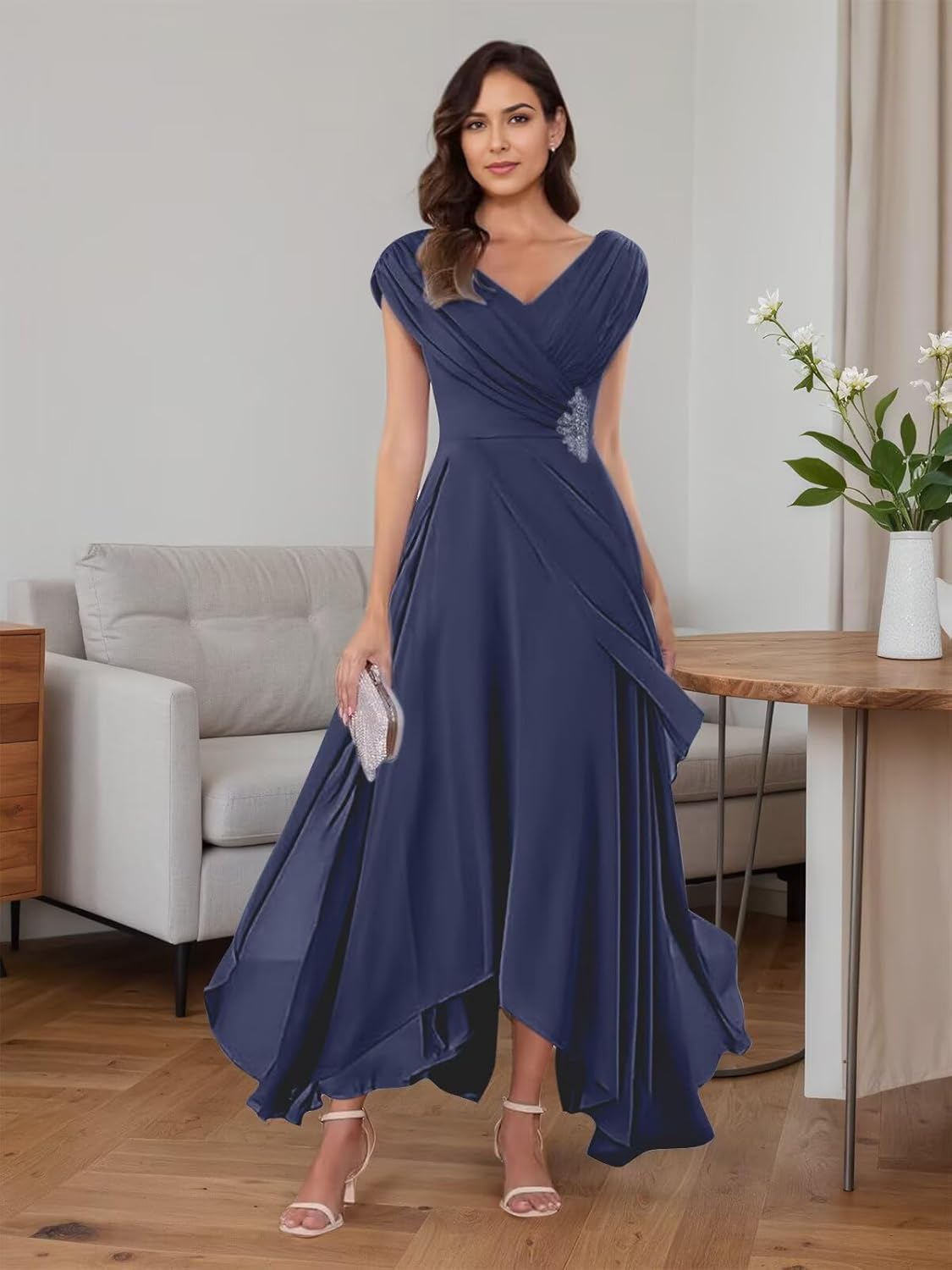 Chiffon Mother of The Bride Dresses for Women V Neck Pleated Wedding Guest Dress Beaded Formal Cocktail Gown