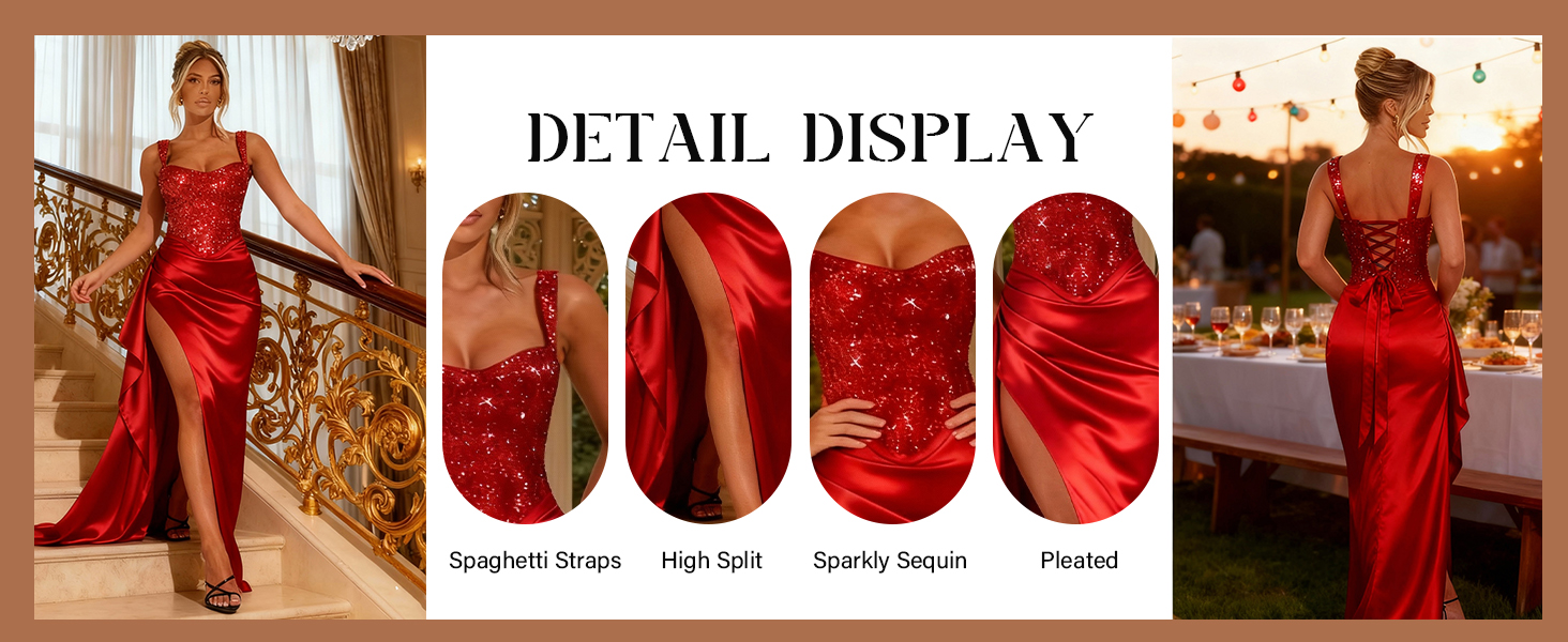 The video showcases the product in use.The video guides you through product setup.The video compares multiple products.The video shows the product being unpacked. Spaghetti Straps Satin Prom Dresses Long for Women Merchant Video Satin Prom Dresses 2026 Sparkly Sequin Spaghetti Straps Formal Dress with Slit