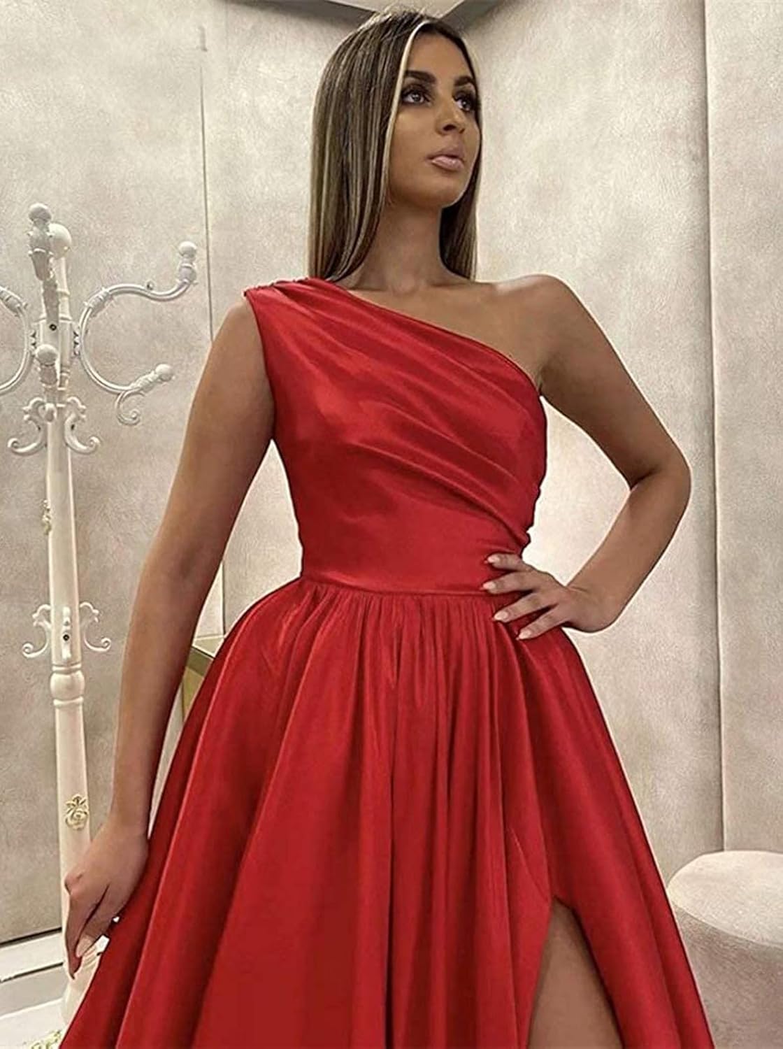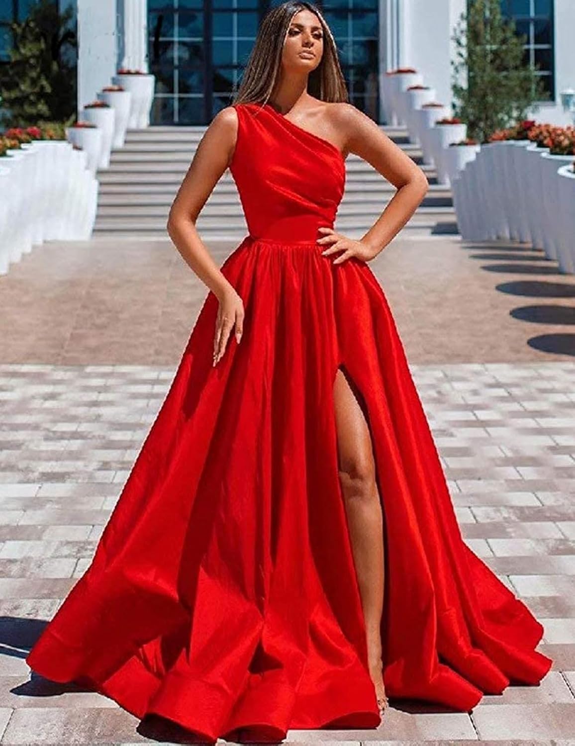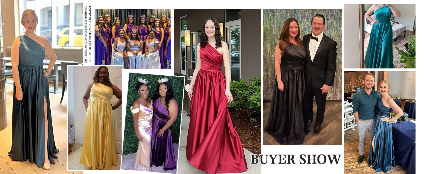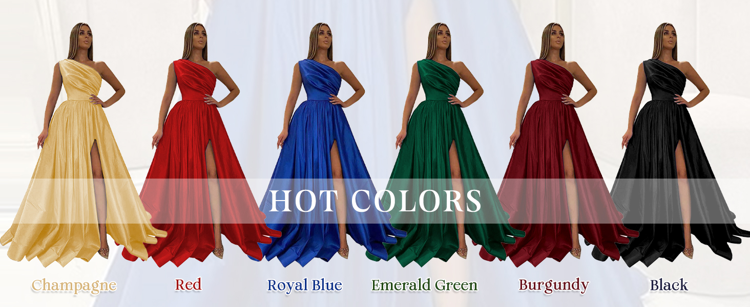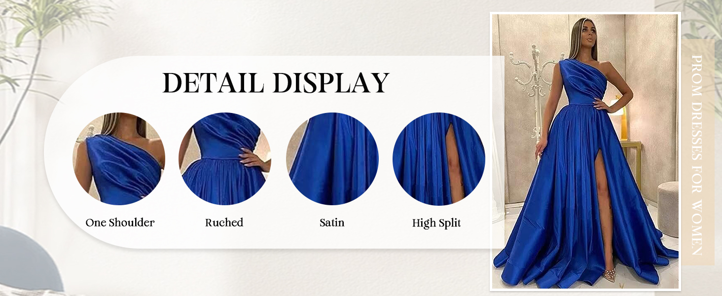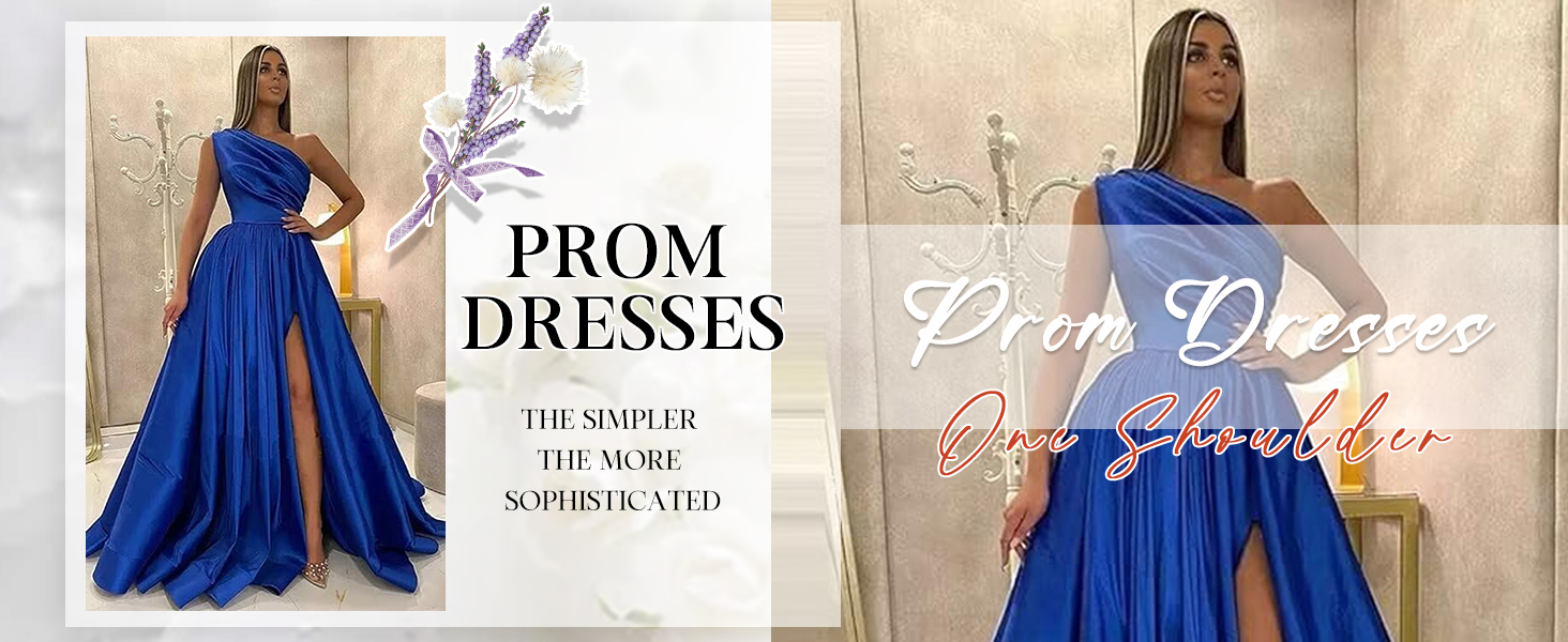One Shoulder Satin Prom Dresses Long Ball Gown with Slit Formal Dress for Women