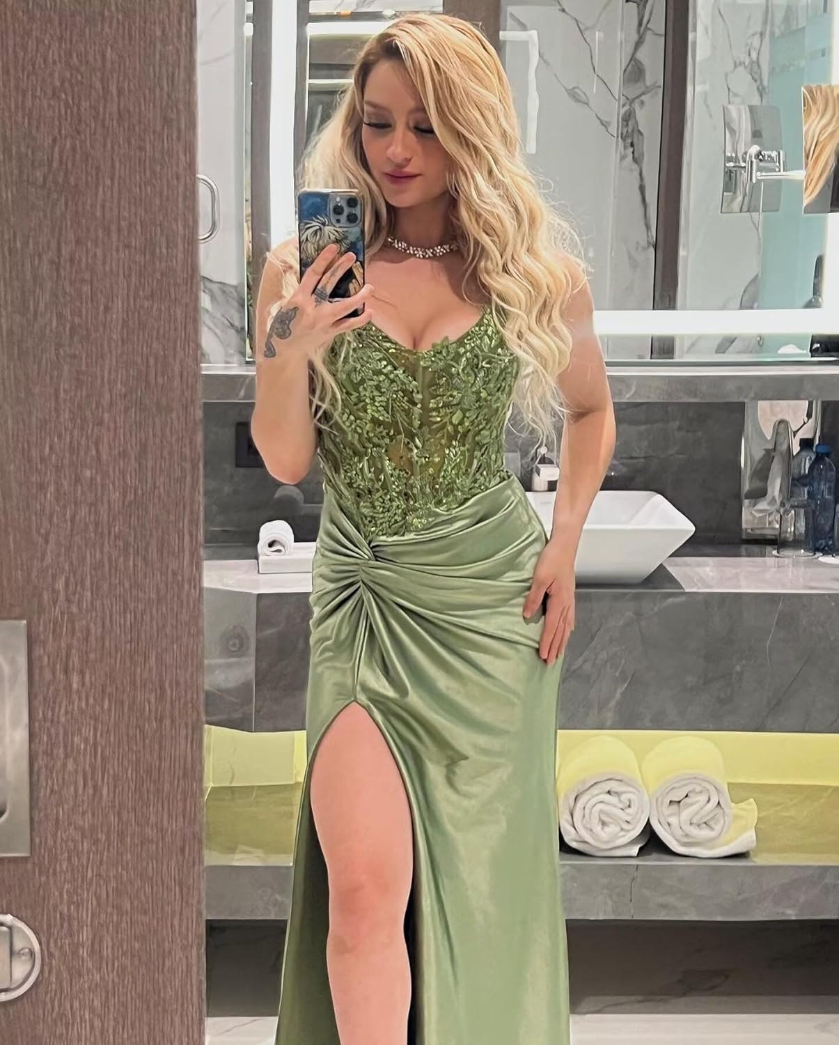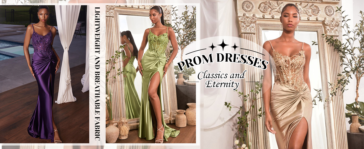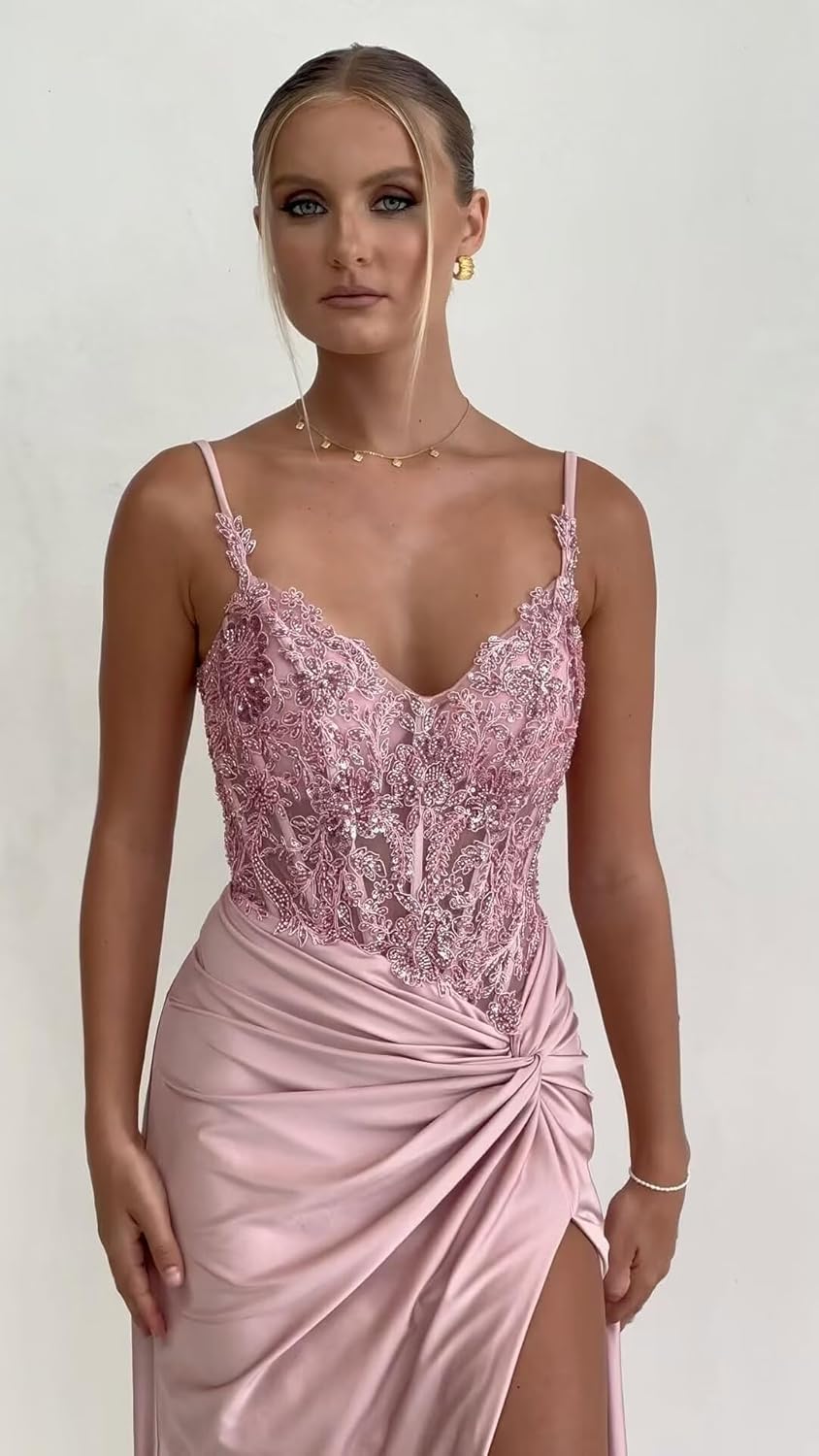 Lace Appliques Satin Prom Dresses Long with Slit