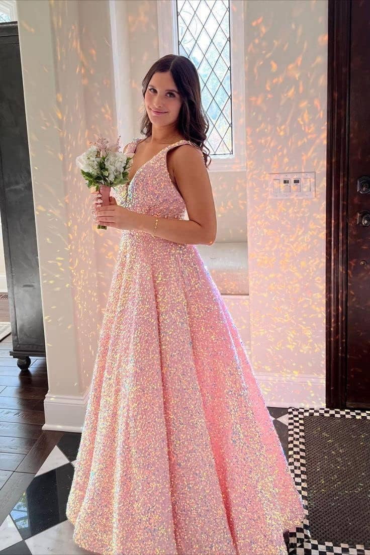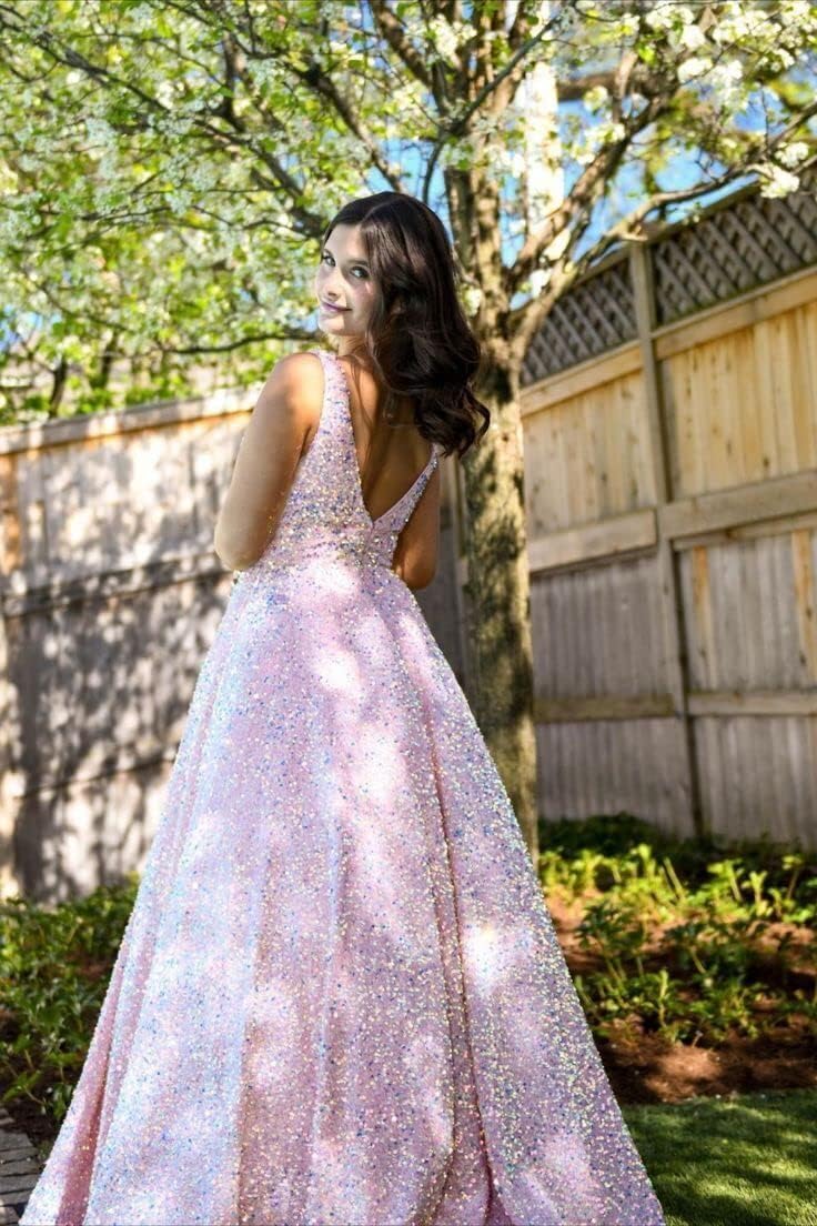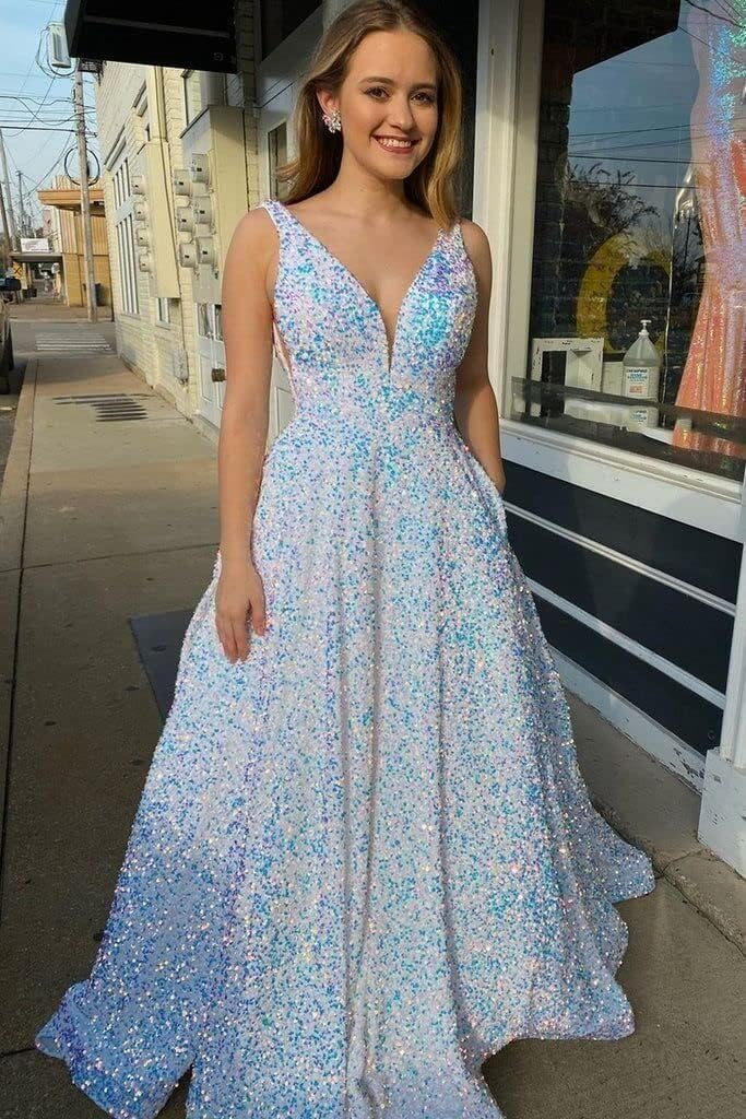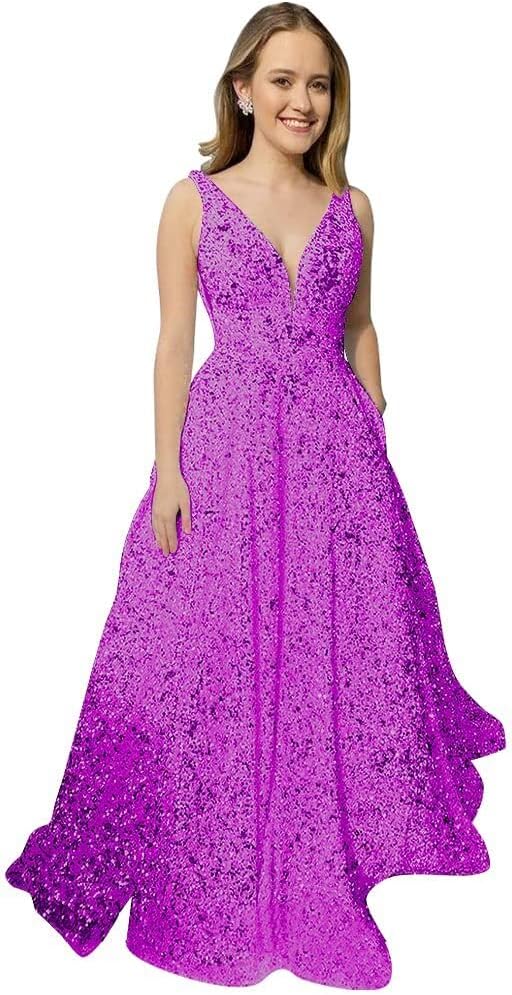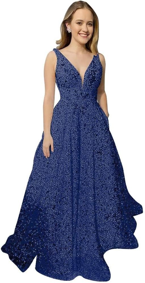Sequin Prom Dresses Long Ball Gown for Teens V Neck A-Line with Pockets Glitter Formal Evening Gowns TBO5