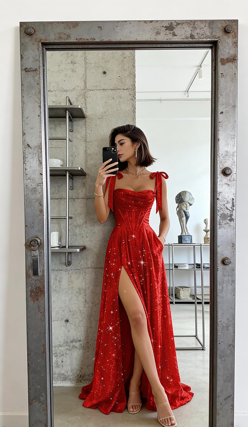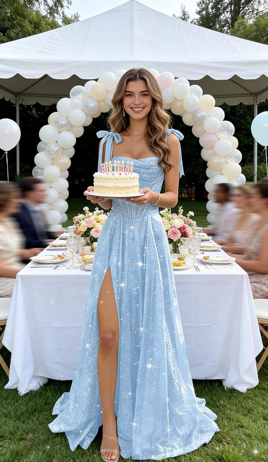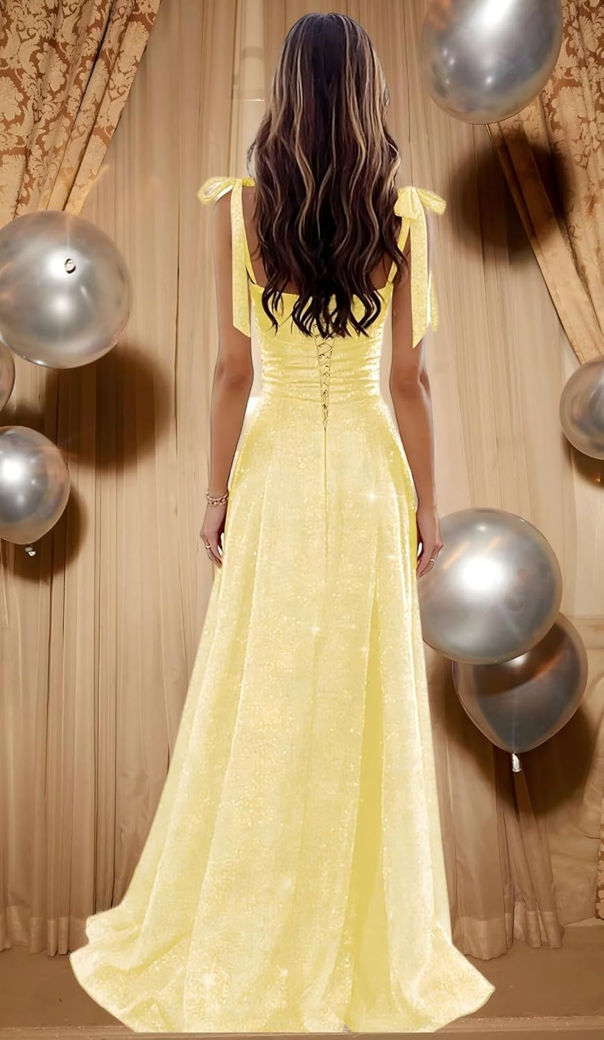 Spaghetti Straps Prom Dresses Long with Slit Sparkly Sequin Ball Gowns Glitter Bow Maxi Cocktail Dress ZU079