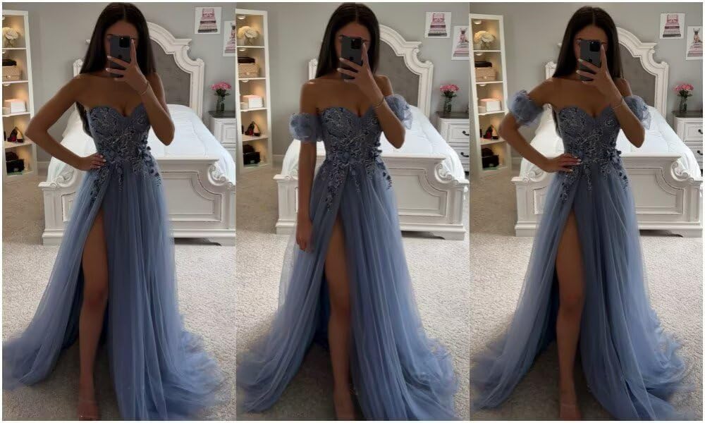 Sparkle Long Tulle Prom Dresses with Sleeve 2025 Strapless Lace 3D Flower Glitter Formal Evening Gowns with Slit Plus Size Light Blue Us24