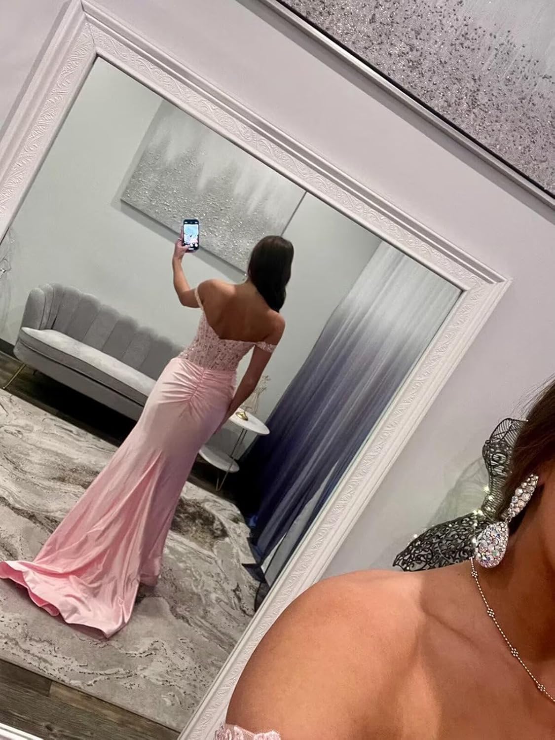 Women’s Off The Shoulder Mermaid Prom Dresses Long Satin Lace Applique Corset Evening Formal Gowns with Slit