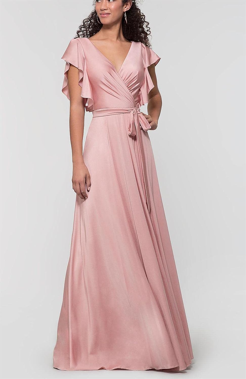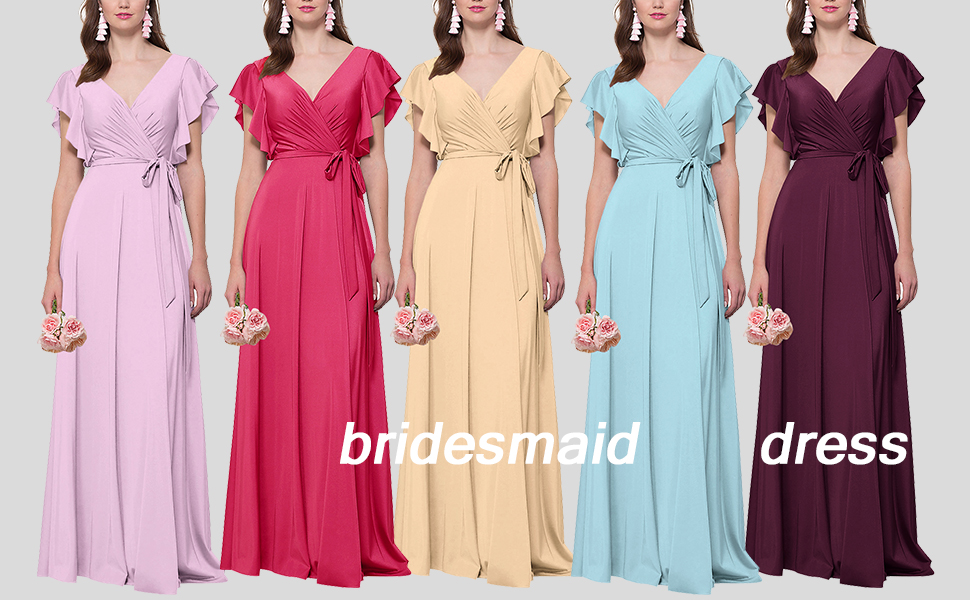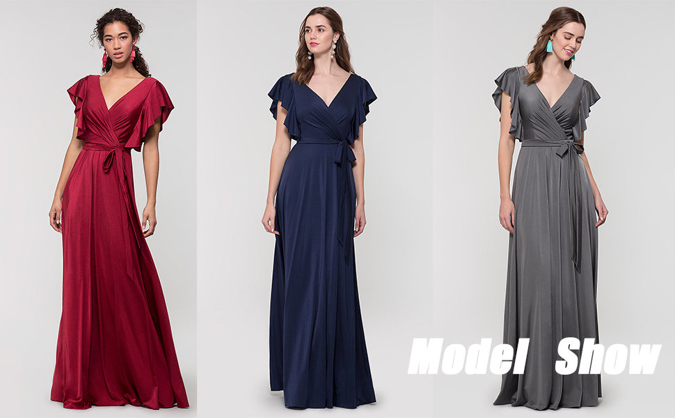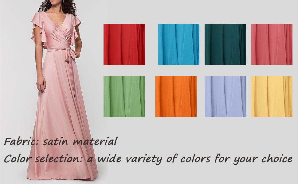 Women’s V Neck Satin Bridesmaid Dresses Long with Flutter Sleeves Prom Dresses A-Line