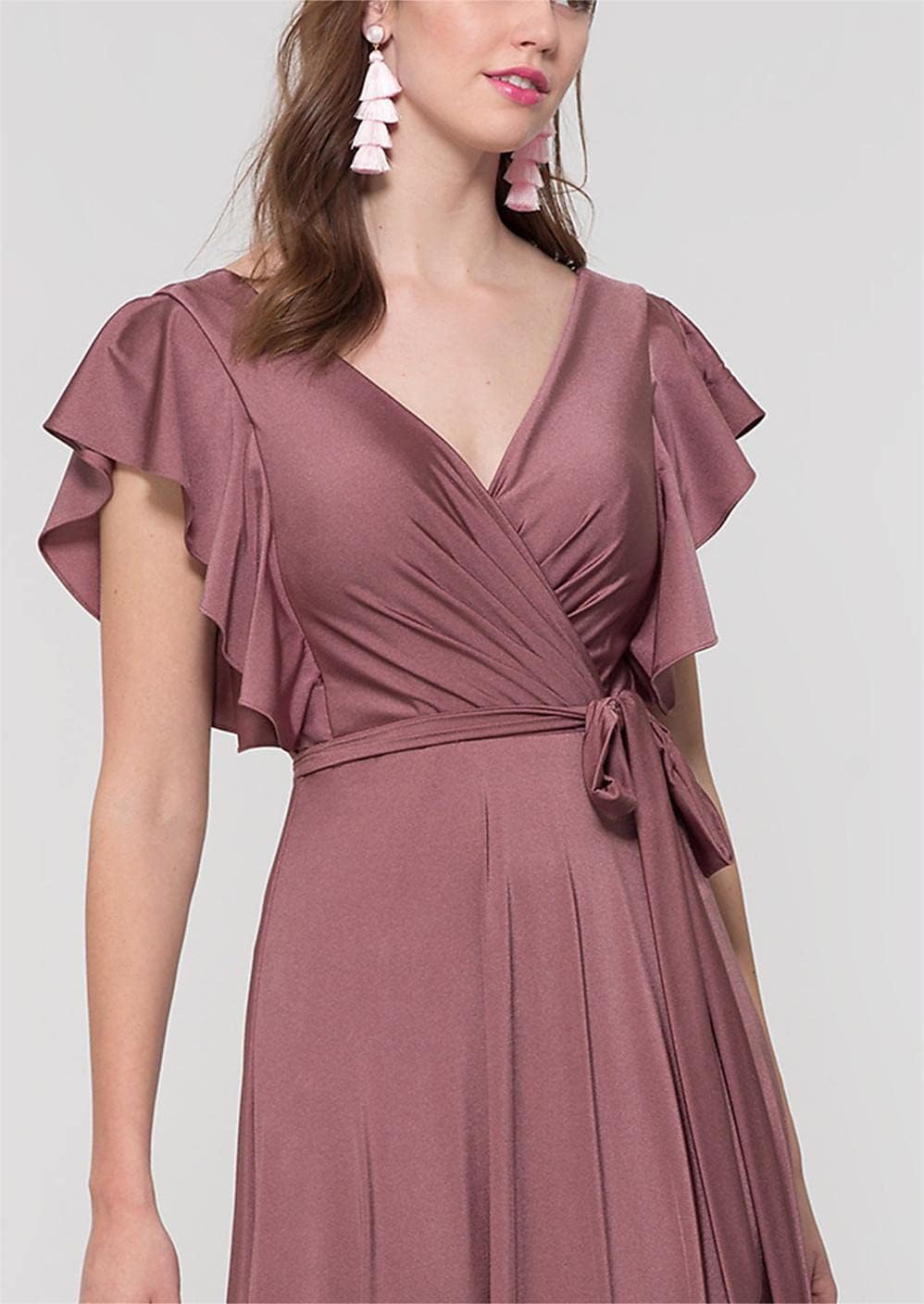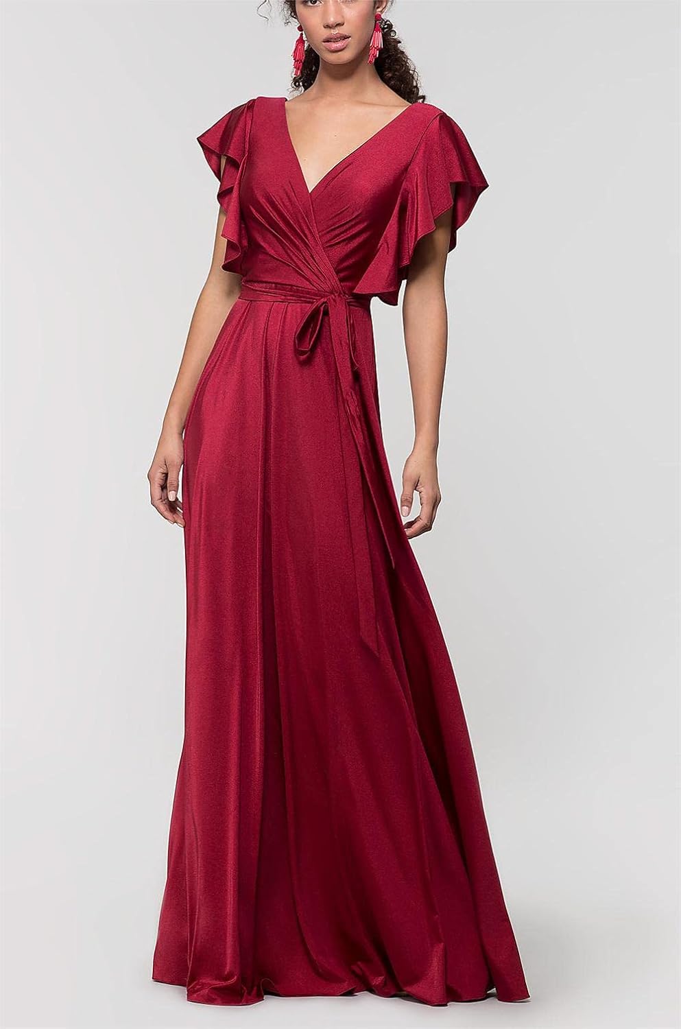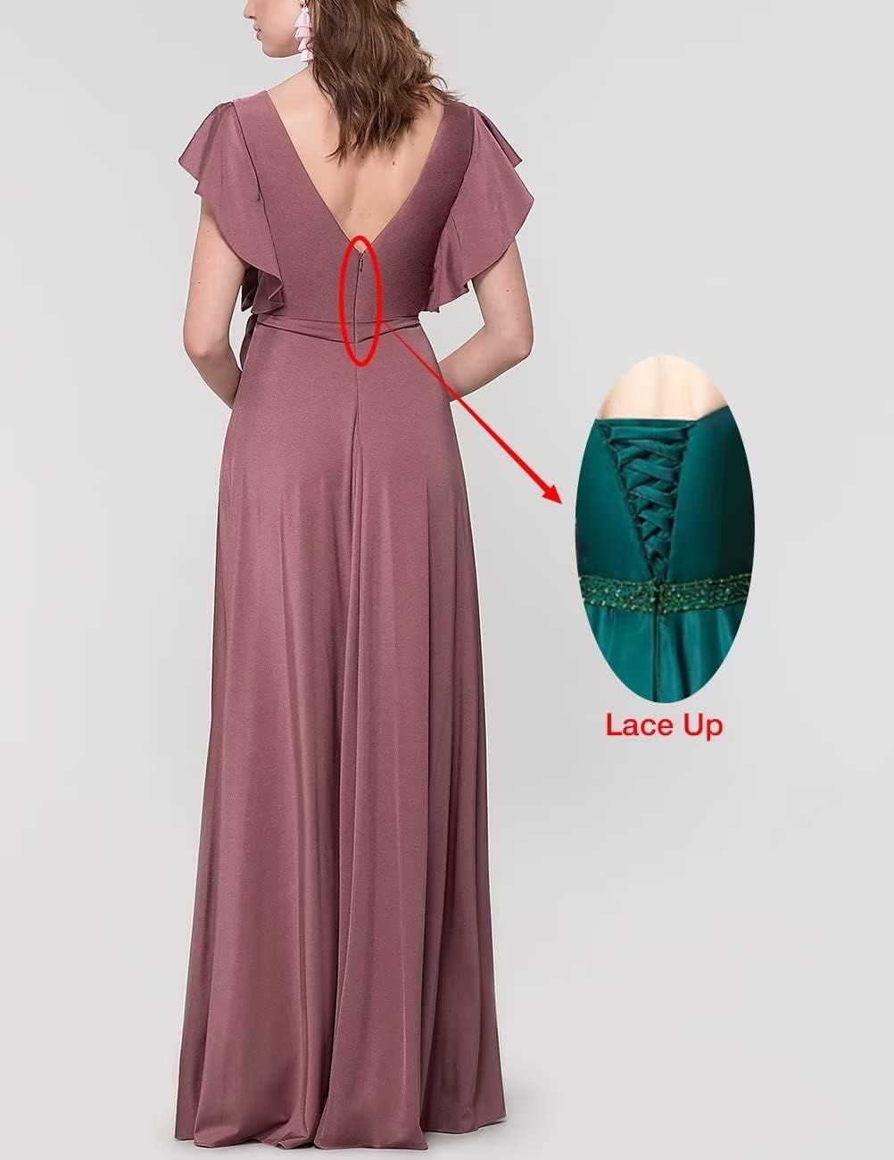 Women’s V Neck Satin Bridesmaid Dresses Long with Flutter Sleeves Prom Dresses A-Line