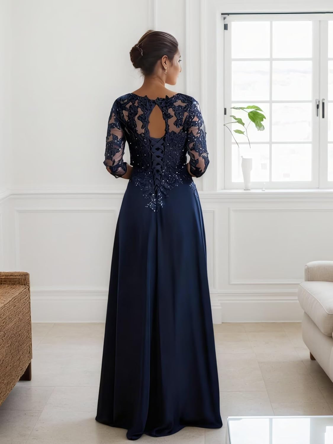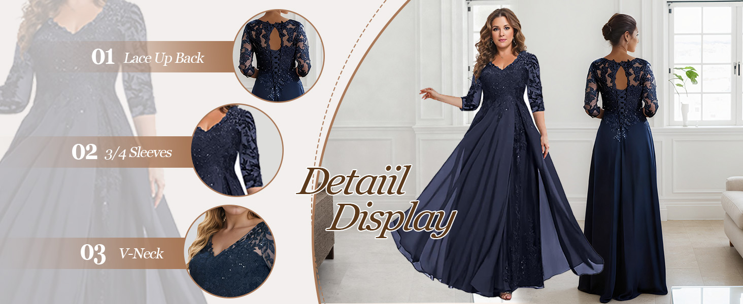 Ruffles Mother of The Bride Dress Lace Appliques 3/4 Sleeve Chiffon Evening Gown