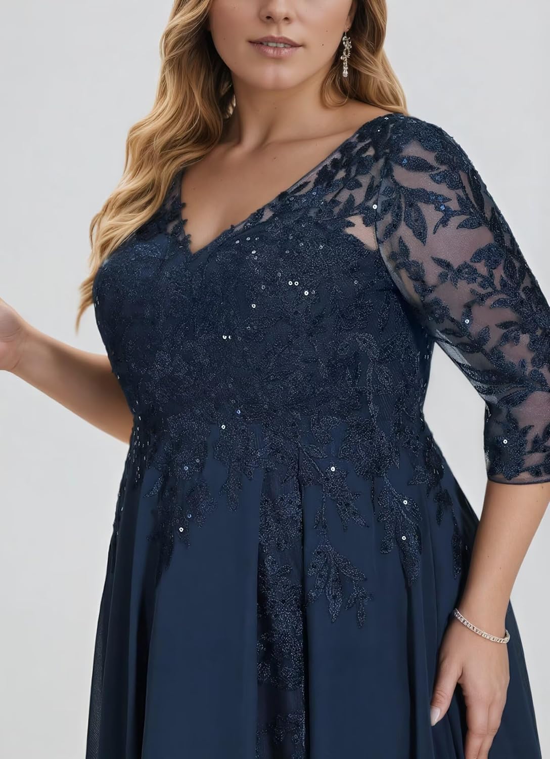 3/4 Sleeves Lace Appliques Ruffles V-Neck Long Sequins A-Line Formal Dress